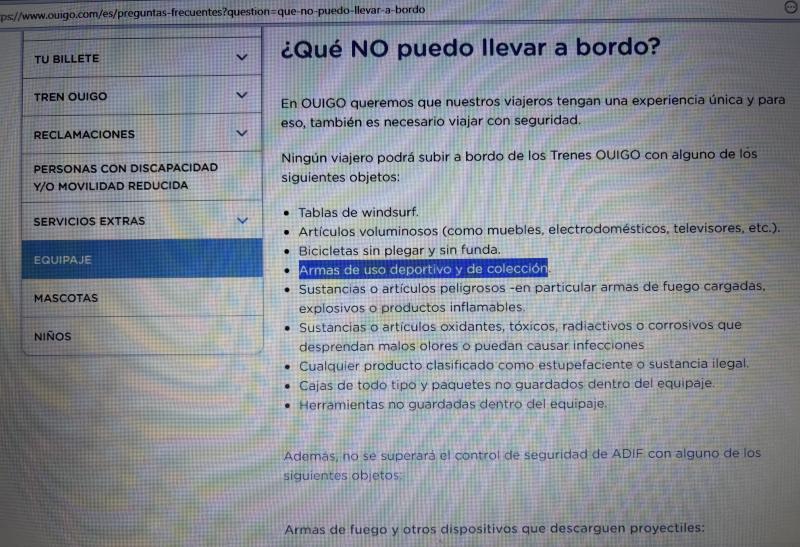 Llegué al control de ADIF y tras las comprobaciones del arma y de la documentación pasé sin problema, pero a la hora de subir al tren de OUIGO los empleados de dicha compañía no me permitieron embarcar en el tren, porque decían que aunque la normativa de ADIF permita que pueda acceder con el arma, la normativa interna de OUIGO excluye el transporte de armas aunque vayan sin munición y debidamente guardadas en maletín como era el caso.