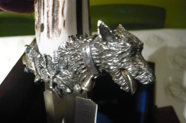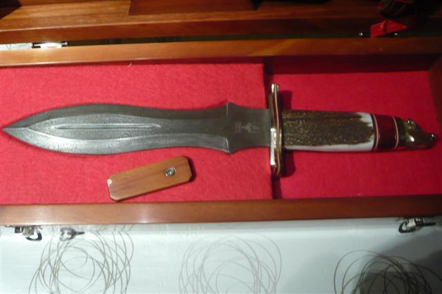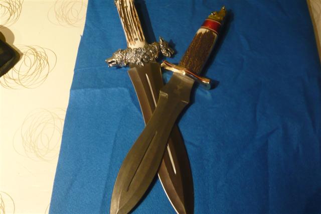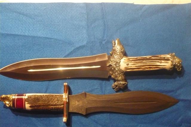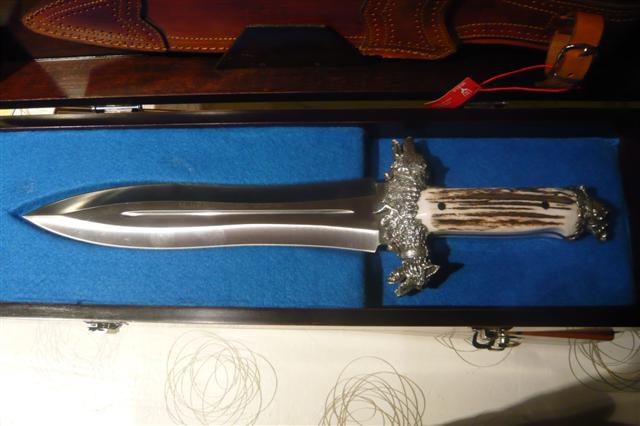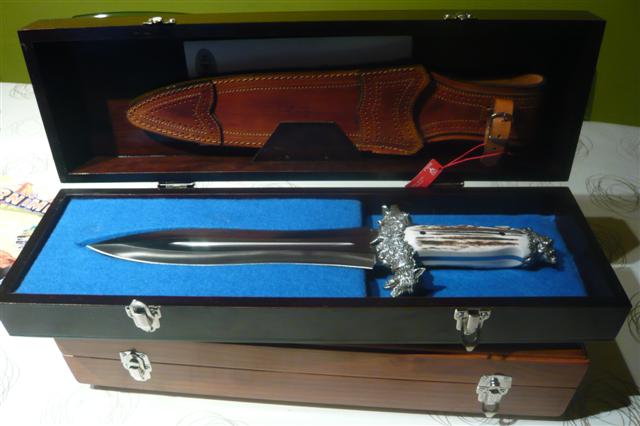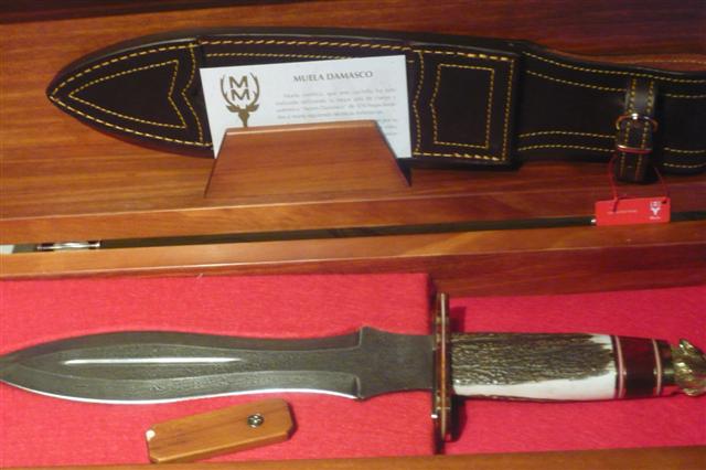 buenas tardes,aqui os presento dos cuchillos de la casa muela,son dos cuchillos para el remate,que obviamente no voy a usar,solo exponer en vitrina.uno es el muela lupus, en acero de damasco,y mango en asta de ciervo.el otro de edicion limitada a 500 unidades,es el podenquero.este tambien en asta de ciervo,la guarda y el pomo estan labrados en plata.espero que os gusten.un saludo