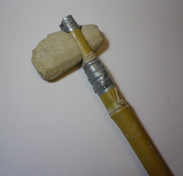 Hola, llevaba ya tiempo dandole vueltas a la cabeza la idea de hacerme un tomahawk, pero como no domino la forja (lastima no haber tenido oportunidad de aprender el oficio pues mi abuelo y mucha familia atrás fueron del mismo, e incluso 2 primos segundos mios aún tiene una "fragua" pero cada vez más dedicados a los aluminios...)pero dentro de mis aficiones es ser coleccionista de utiles prehistóricos y fósiles, entre otras muchas...y tenia por casa desde hace varios años un hacha de piedra (silex), mejor dicho "hachuela" del Neolitico (5.500 años a.C.)europeo; total que he pensado hacerme un stone tomahawk lo mas parecido a los originales...he pillado unas tiras de cuero negro que estaban muy secas y las he puesto blandas con grasa de caballo, las tengo dentro de una bolsa para que se impregnen bien..y con una caña de bambú, india como decimos pòr aqui, que son muy duras y a la vez flexibles, me estoy haciendo este "arma terrible"...estoy en el paso primero como vereis le he puesto una cuerda y cinta aislante para que vaya tomando forma,la piedra dentro de la caña; tambien a la parte de la caña que sujeta la piedra le he puesto un poco de pasta adhesiva; mañana le quito esto y procederé a atarla con las tiras de cuero; voy a pillarme unas plumas en la tienda de los chinos y con una piel de conejo y alguna cosa más que tengo haber que me sale...os adjunto las primeras fotos...cuando la tenga terminada pondré el resto.Disculpad el ladrillo.
