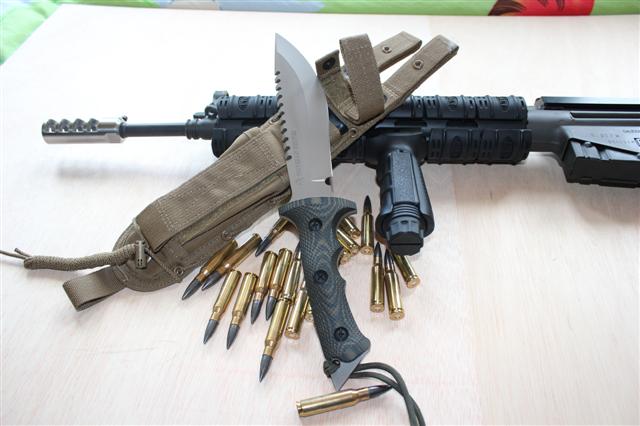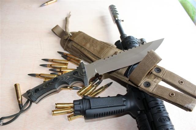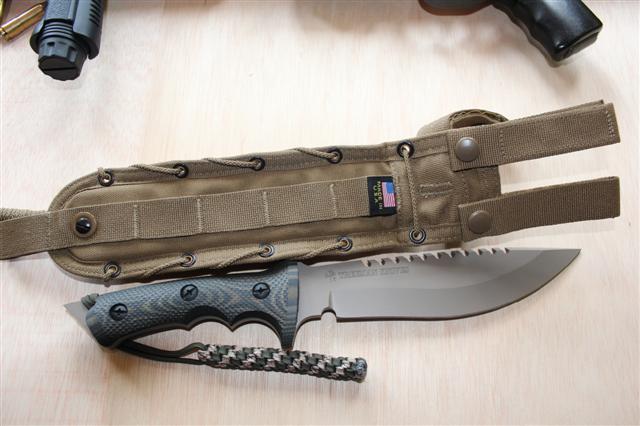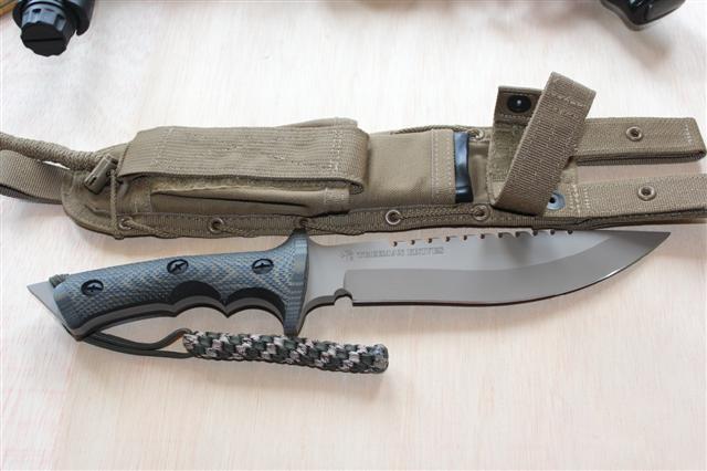 hola,aqui os presento a una bestia de combate recien llegada.es un cuchillo de combate de la casa treeman.tiene un largo total de 35,4mm,6mm de espesor,y una anchura maxima de 5cm.tiene una dureza de 57/58rc.el mango esta echo en g10 texturizado.la funda es de cordura de naylon,de la casa espec ops.ahi se ve al lado de un jungle king ,para comparar grosores.espero os guste.un saludo