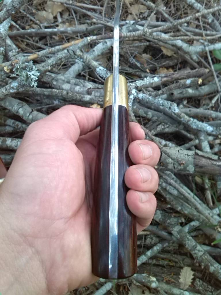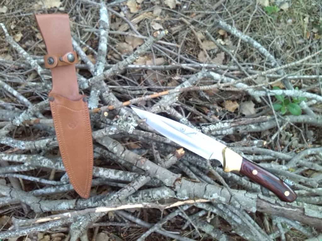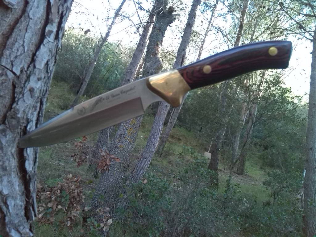 Este precioso cuchillo está realizado en acero, opino que debe de ser 440, virola y pasadores de latón, mango de madera y su hoja enteriza tiene un espesor de 4mm.