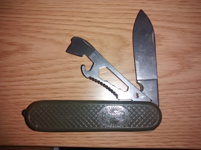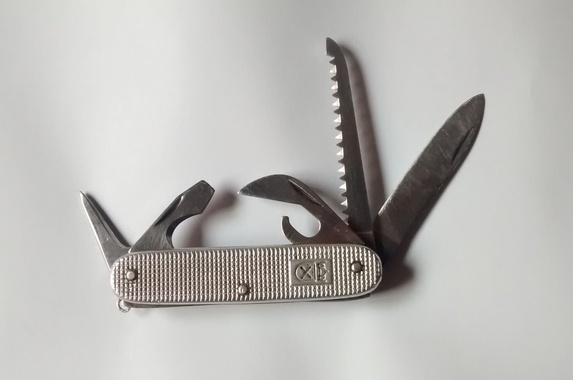La tengo desde hace treintaytantos años, fue un regalo de Reyes cuando tenía 11 o 12 años, y en mi infancia y adolescencia rural la di mucho uso, he cortado con ella muchos palos, cuerdas, perforado cuero, hojalata, sacado balas de árboles, se me cayó de un tercer piso arreglando una persiana, etc, etc ... y también mis dedos tienen muchas marcas de todas las veces que me corté con ella, tiene las señales de haberla dado mucho uso pero está en buen estado ...