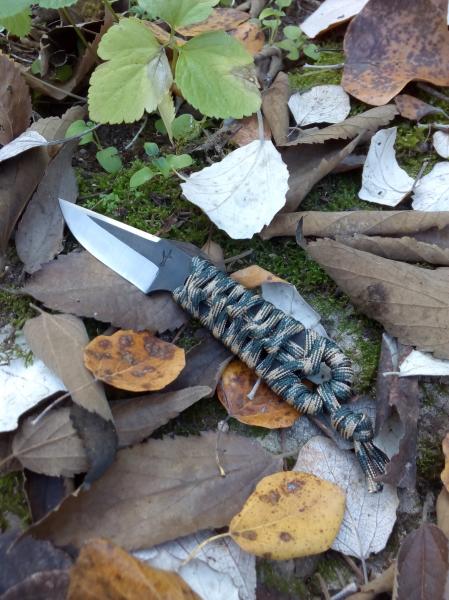 Con un filo de 70mm , 4mm de grosor en el recazo ,encordado en paracord camuflaje y funda de kídex a juego.