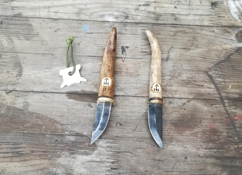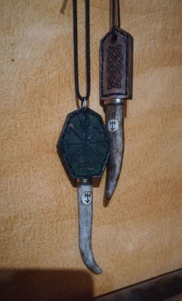 Así, han salido estos dos en punta de reno. He grabado una runa en cada uno (no runa de escritura, sino runas "mágicas" o talismánicas). Acorde con el tema nórdico, que es de donde vienen los materiales de ambos. La runa en cuestión es la de protección en el viaje, entendiendo este a veces como algo más que un desplazamiento.