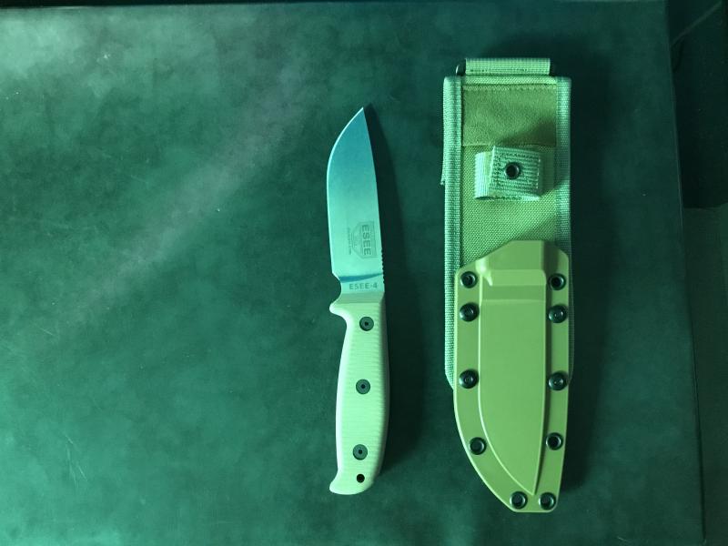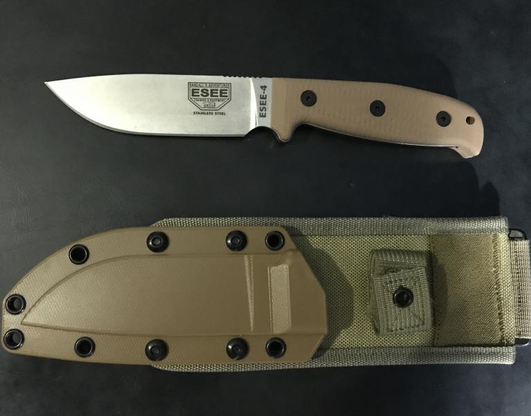 Buenas, pues eso que me compré el ESEE-5 pero para el uso que le quería dar era demasiado pesado y he adquirido este ESEE-4 con acero 440C, originalmente venía con cachas de micarta verdes y vaina negra, no me gustaba mucho y lo he personalizado un poco, con cachas en G-10 marrones, vaina marrón y sistema de transpote y sujección caqui compatible con molle, os dejo unas imágenes a ver qué os parece.