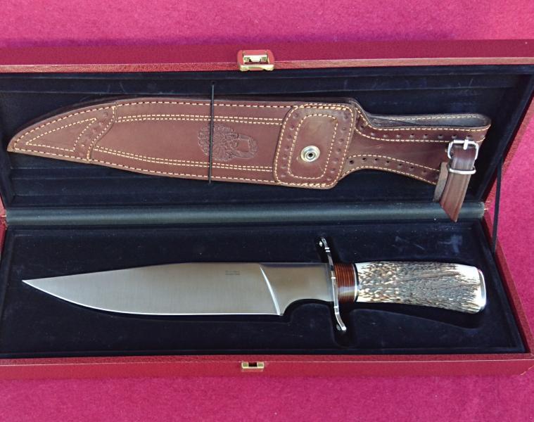 Preciosos vuestros " Fierros " compañeros. Yo tengo pequeñas colecciones de navajas y de espadas japonesas, pero no tenía ningún Bowie ya me estaban llamando la atención. Tras darle unas cuantas vueltas y considerar distintas opciones entre las que se contaban uno de Angel Corts que vendió en esta web un compañero, y al que llegué tarde para comprar, algún Cold Steel, algún CASE, etc, y teniendo en cuenta que va a ser mas para exposición que para uso en el campo, me he comprado este Muela Magnum 26 :
