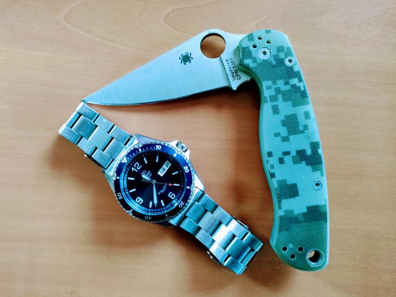 El conjunto de hoy y de muchos dias. Habitualmente usado para el curro. Poco tiene que decirse de él. Fiable, Fuerte y Robusto. Orient MakoII y Spyderco Paramilitary 2
