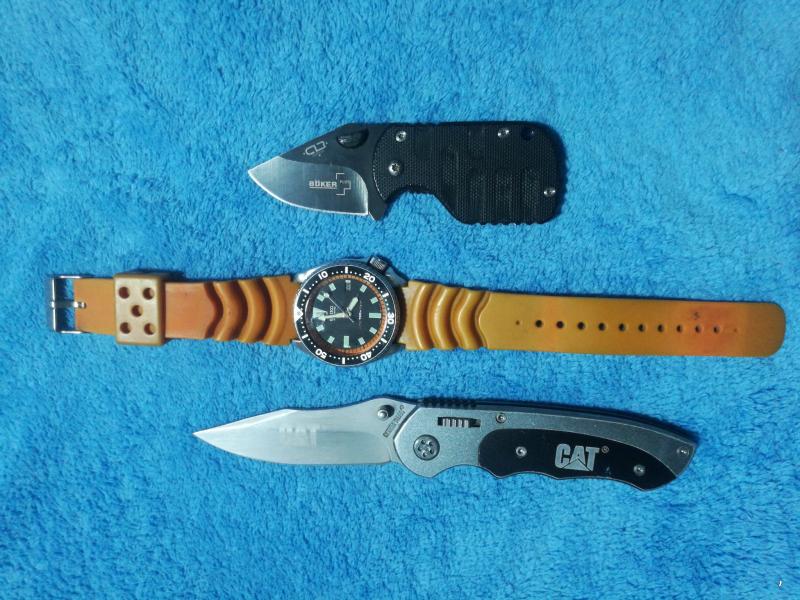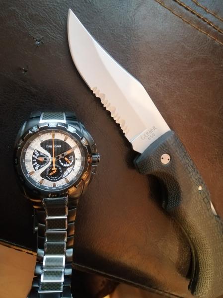 El Time Force, para el finde, y puedo usarlo como arma arrojadiza con lo que pesa el condenado. Y la, Gerber para el campo o las barbacoas, conseguida en unas maniobras, en San Gregorio, se la cambie a un yanki por una de mariposa.