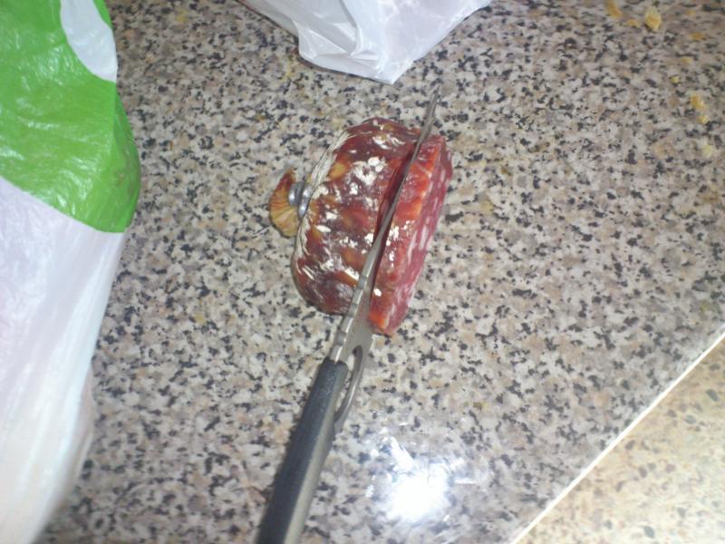la prueba ha sido con salchichon en las fotos se ve hasta donde ha cortado con un solo tajo hacia delante, lo que ha dado la hoja, haciendo un poco incidencia desde arriba, pero bueno ya se ve lo que ha cortado :wink: