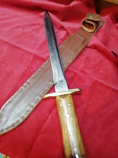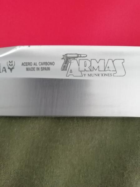 Estupenda herramienta. No sé que hace de longitud la hoja, pero robusto y con presencia. Por el encabado sencillo pero eficaz, y el tratamiento de la superficie de la hoja recuerda en parte a mi macho riojano de Azote, el que colgué al principio de la tira. Cuchillos al natural, sin concesiones de ningún tipo.