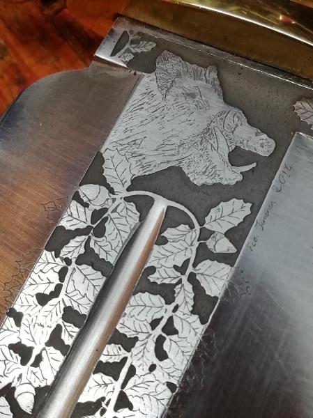 Esta grabado al ácido con un jabali y hojas de encinas y bellotas.