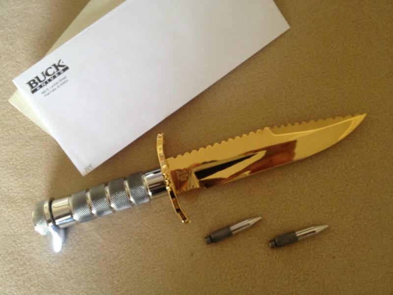 permitidme que ponga una foto del buckmaster 184 gold,se que es una version limitada,pero no se nada mas.puzzling a ver si nos comentas algo sobre el cuchillo este.y de paso subimos el post que se lo merece y es muy interesante.alguien lo conocia?esta foto la baje de ebay,hace dos o tres meses,estuve a punto de pujar por el(me quede con las ganas).al final se vendio por unos 2000 dolares.supongo que esta version se habra echo exclusivamente para coleccion.un saludo