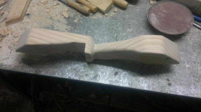 La empuñadura esta hecha a partir de un fondillo de madera de los que se usan para encofrar, primero diseñe una plantilla en carton y cuando me convencio lo pase a la madera, despues cortar con la caladora y de ahi en adelante limar para dejar todo bien a escuadra, formon para desvastar las formas y lijar a mano y con paciencia hasta dejarlo decentemente terminado.