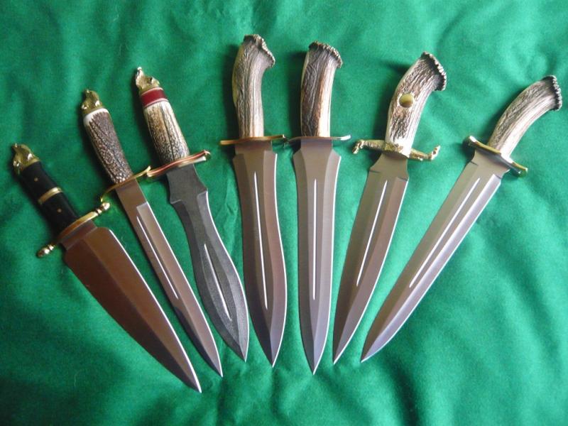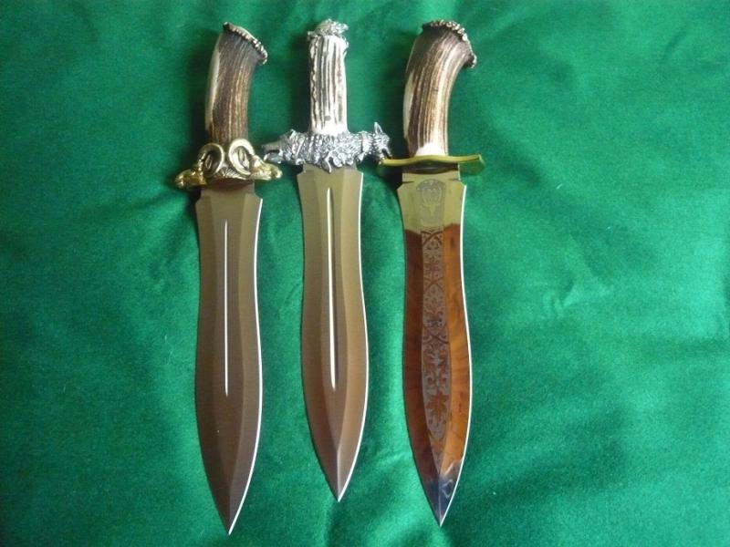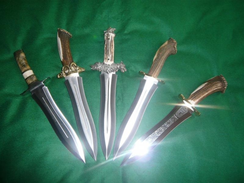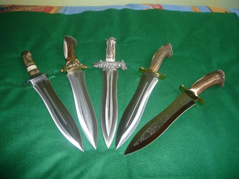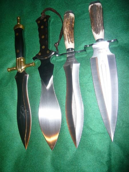 bueno,ahi van unas fotillos.en la foto se ven un podenquero customizado en madera de buckeye,y asta de reno,con unos espaciadores de laton,pomo y guarda en inox pulido a espejo,le sigue una version del podenquero llamada muela muflon,a su derecha,y para mi el santo grial de los podenqueros,la version de lujo con guarda y pomo labrados en plata,y al lado el podenquero normal con roseta,y por ultimo otra version de lujo,con la hoja grabada.
