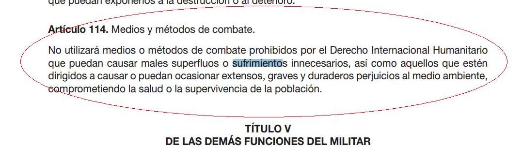 No utilizará medios de destrucción prohibidos ni causará daños inútiles o que produzcan sufrimiento innecesarios; no permitirá saqueo, pillaje o venganza. Tratará humanitariamente a las personas ajenas al combate y respetará, de conformidad con las leyes y usos de la guerra, hospitales y edificios de carácter religioso, cultural o artístico, siempre que no estén destinados a fines militares.