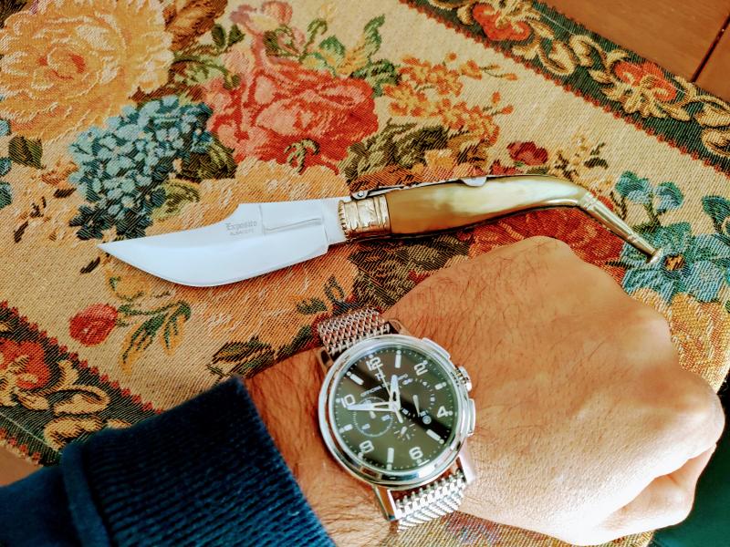 El reloj poca explicación tiene. El cuchillo es uno de esos de "gentelmen" de Fermosos Fierros inox con muela de mamut estabilizado, cuando lo saco en un restaurante me miran mu raro.....pero todo el mundo pregunta