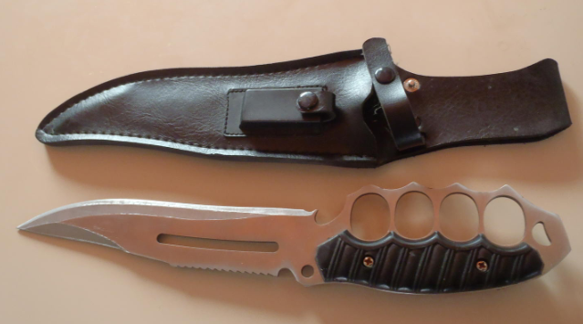 En primer lugar, en España, es un arma prohibida al tener llave de pugilato (puño americano), aparte de que para mi no vale nada, no porque sea oriental ya que en Asia hay desde cuchillos muy buenos a muy malos, ni más ni menos que como en todos los sitios, pero solo hay que ver el cuchillo, las cachas y la funda.