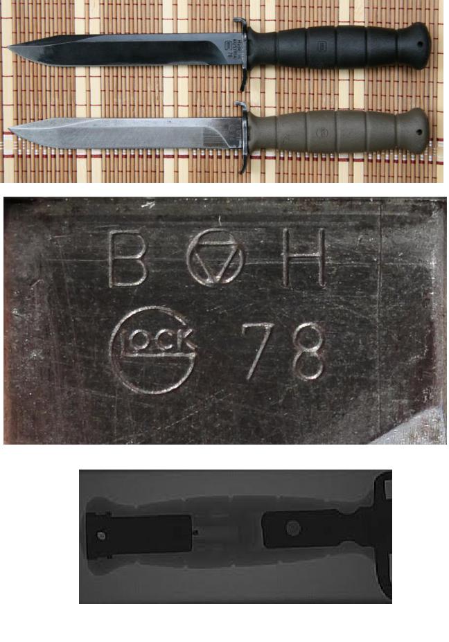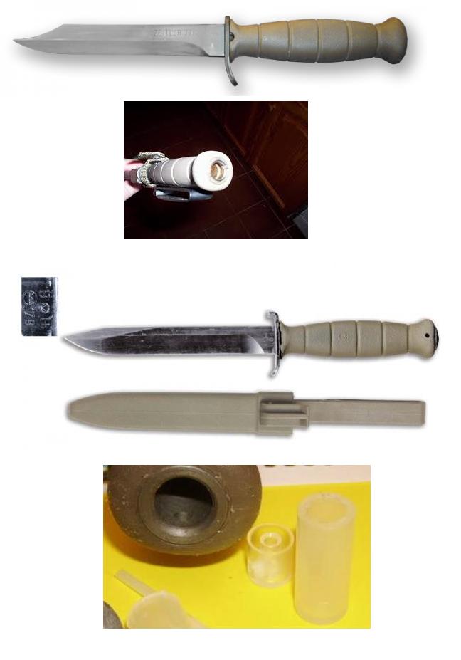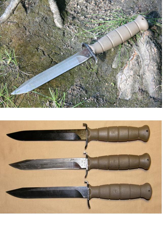 La otra opción (no la descartes) es que el cuchillo que nos venden sea como el de la bayoneta reglamentaria pero habiendo sustituido la guarda con agujero para el cañón por otra convencional, no habiendo eliminado el agujero del mango y su tapón por ser innecesario para su uso como cuchillo de combate/supervivencia.