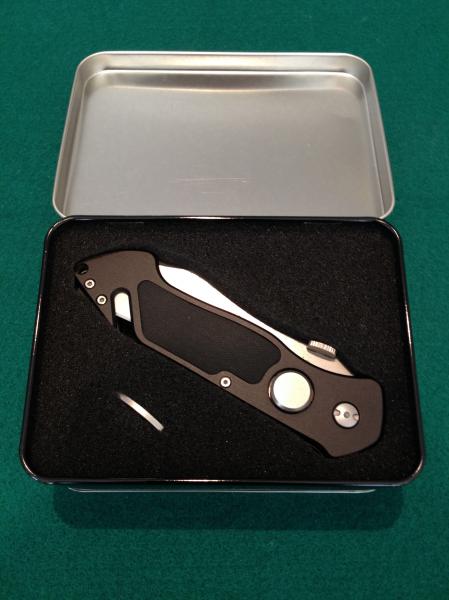 -Servida en una estupenda y elegante caja de aluminio acolchada en su interior, que incluye llave específica para el montaje y desmontaje de la navaja en su mantenimiento, o la regulación de resistencia de basculación de la hoja.