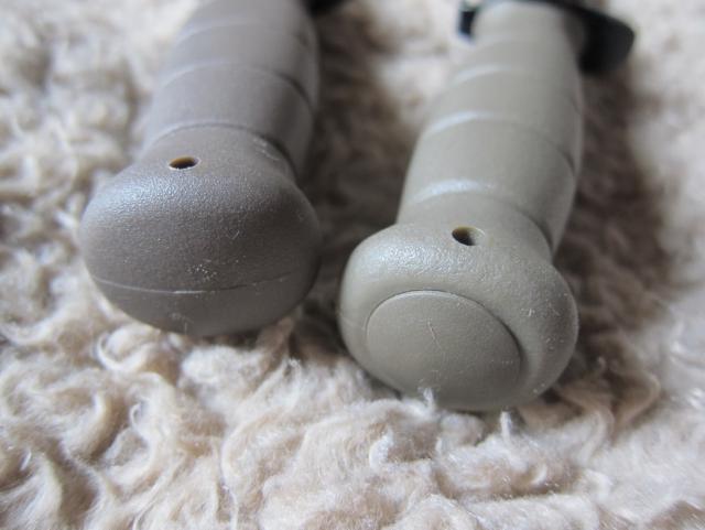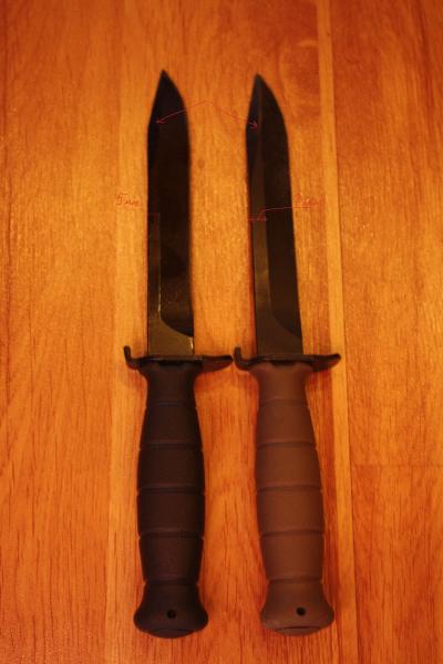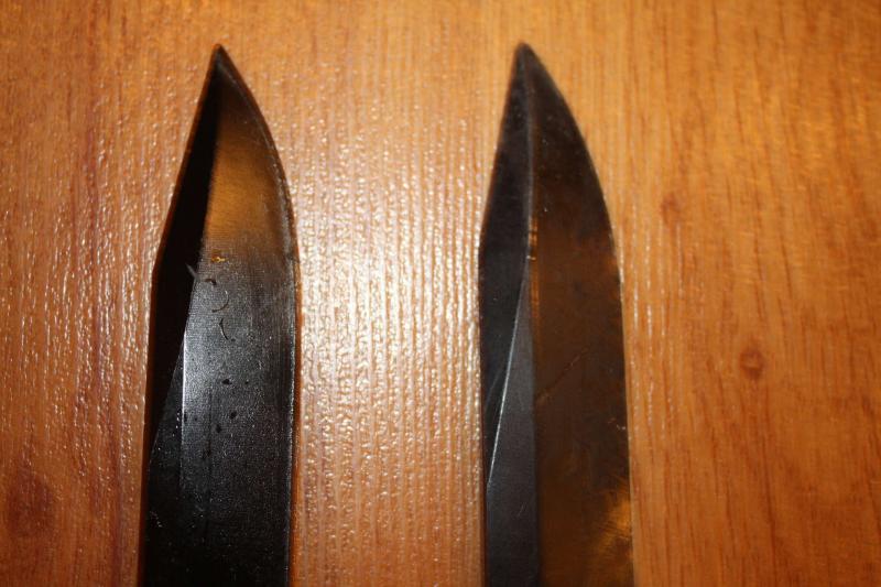 Son ambos verde oliva. El antiguo está un poco usado y le eché pavón en frío hace poco en el filo (se ve la mancha a lo largo). Sí que tiene el nuevo el vaciado más ancho, sí; no me había fijado.