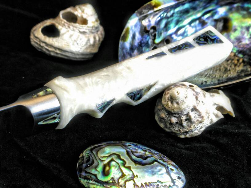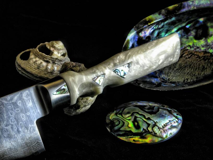 Hola os enseño un cuchillo que hice hace un año con una hoja de acero inoxidable de damasco VG10 japones. El mango lo hice con resina acrílica con forma anatómica y le incrusté unas piezas de nacar de oreja de mar.