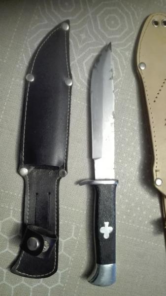 El segundo es el que me tiene intrigado, en el mango por una cara tiene un trébol y por la otra una pica, como los símbolos de las barajas de póquer y la hoja tiene algo de óxido, parece antiguo.