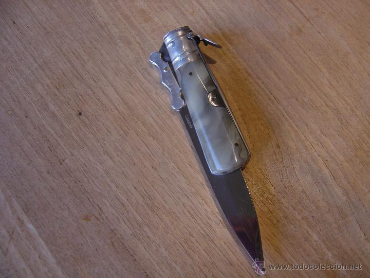 Es de los pequeños, con unos 14 cm de hoja, ligero y manejable. Cierre de palanquilla y cachas de nacarina. (sigue)