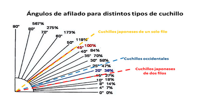 Ángulo de 20º: Es el ángulo que más a menudo se utiliza, ofrece una gran ventaja sobre todo en cuchillos de cocina y cuchillos de filetear.