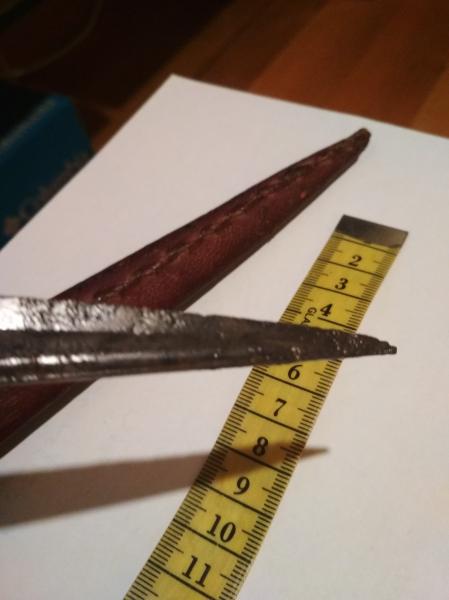 El espesor de la hoja es de unos 3 mm. Y el lomo es en forma de T, la punta está algo doblada con pinta de que ha pinchado jejejeje!!!! Ahí van más fotos