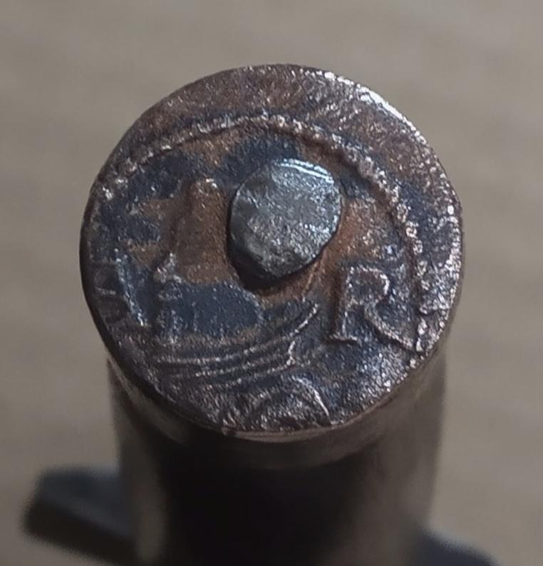 Buenas, espero que esteis todos bien...hace poco he conseguido un puñal o mejor daga española del XIX, si no estoy equivocado...y limpiandola un poco he descubierto encima del mango en la zona del remache de la cola de rata un relive y dos letras A R, y lo que parece la cabeza de un caballero de época...¿alguien puede ayudarme a identificar este cuño? os dejo fotos...gracias y un saludo.
