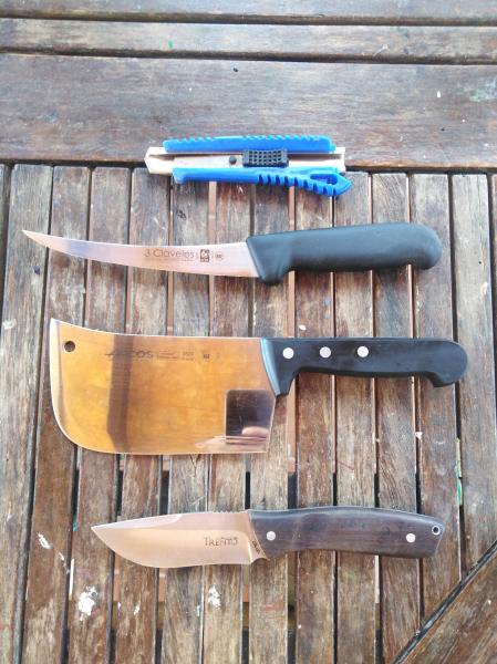 Yo uso uno de hacheta de carnicero para cortar tendones y articulaciones. Uno de hoja fina y punta para cortar carne y quitar piel. Tambien saco los lomos con ese de hola fina, larga y punta.
