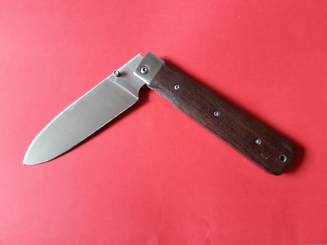 La primera me encanta...me recuerda a la típica navaja machete de Albacete, en la foto no se aprecia bien, parece tener el bisel al estilo de las pallarés, que tienen un vaciado plano que se puede afilar muy bien y el tacto de la madera me gusta más que los sintéticos. Un poco de aceite cada cierto tiempo aparte de darle lustre evita que se agriete
