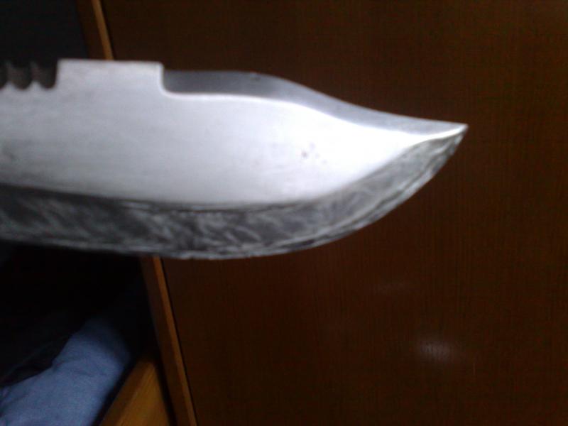 con una dremel y el disco de pulir, (el disco de lana) y mucha paciencia dejaras las mesas del cuchillo pulidas, no hagas la hoja solo las 2 mesas sel filo.