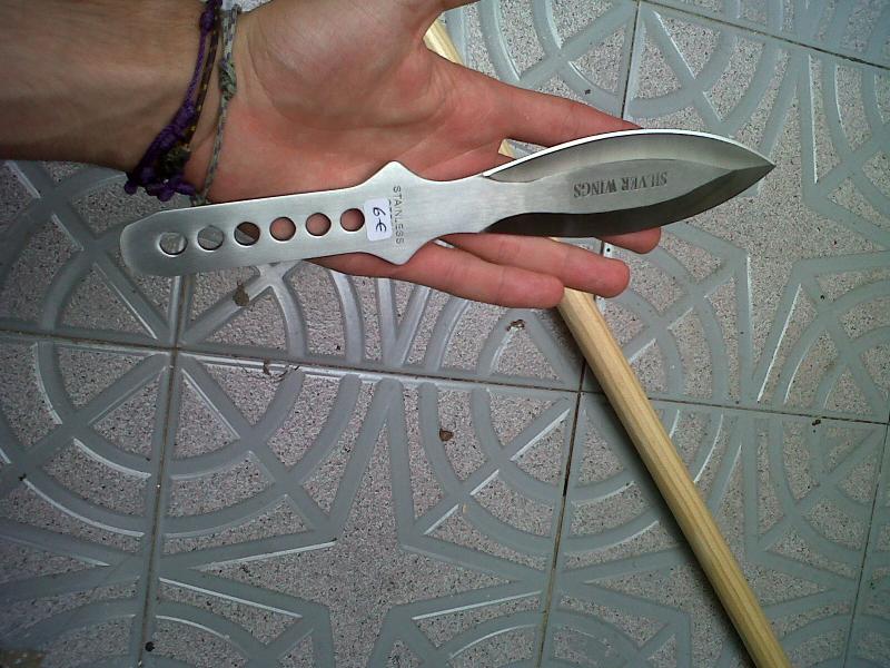 El lunes ire a Leroy Merlyn, comprare un "palo" de madera (ese tipico palo largo con forma cilindrica que llevan los cepillos de escoba, rastrillos de campo,etc...) escogeré uno suficientemente grueso pero ligero.En un extremo le haré un surco, en el cual introduciré un cuchillo de lanzar que tengo, todo irá bien sujeto, pegado, y exteriormente prensado con piel.