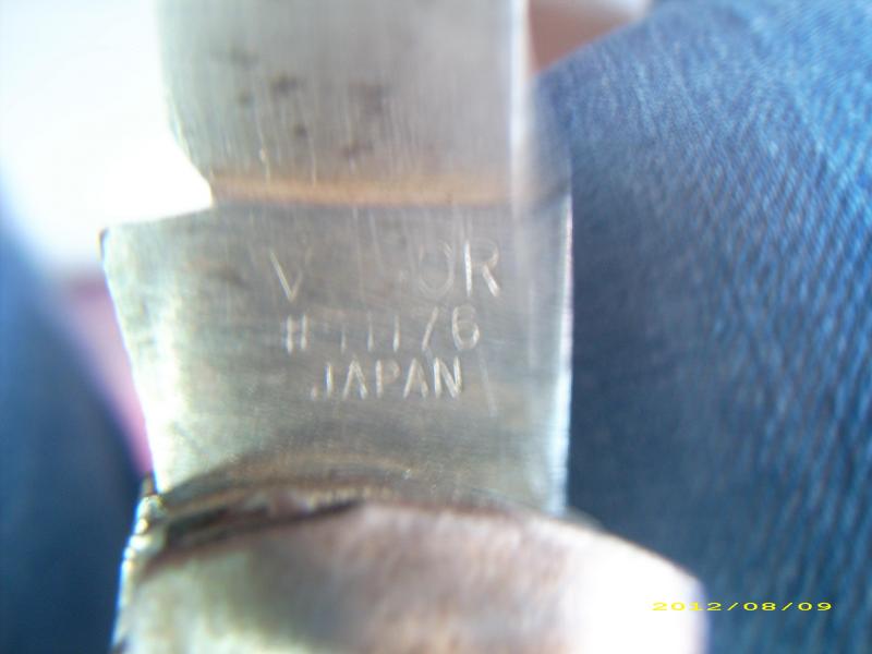 En la hoja tiene marcado un sinbolo como la almoadilla de los telefonos, la leyenda medio borrada V--OR, la numeracion 11176 y mas abajo pone JAPAN. He leido desde que es militar de la WW2 hasta que es de los bois scaus(o como se escriba). Bueno ya me direis algo, dejo unas fotos algo malas pero es que no tengo otra cosa. SALUDOS.