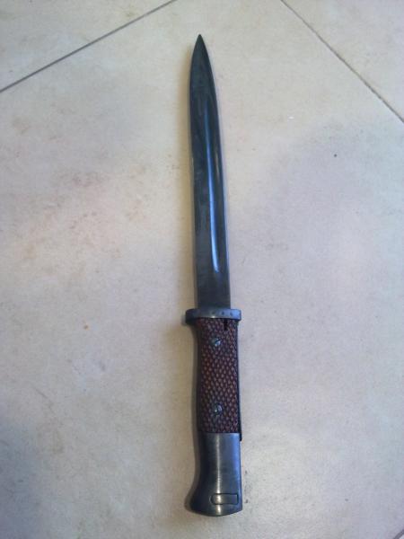 "Es una bayoneta de recomposición, se hicieron aprovechando empuñaduras alemanas y polacas y diferentes hojas. Aparte de los marcajes, se diferencia de las del 98k en la mayor distancia que separa el vaciado de la hoja de la guarda de la empuñadura, son de los años 40, la de Miliciano debe llevar cachas originales, pero la de Galil lleva cachas cuadrilladas al estilo de la española 1913, si quitáis las cachas, veréis que la hoja está soldada en vez de ser enteriza con la empuñadura.