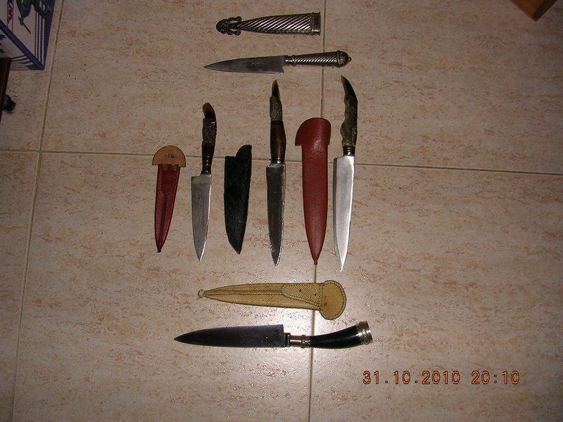 El de arriba en alpaca, tanto funada como empuñadura, tres con empuñadura de dedo de Ñandú y el de abajo con hoja Böker Germany, empuñadura en cuerno de toro y guarniciones en plata con el sello y el nombre del orfebre, funda en piel de potro.