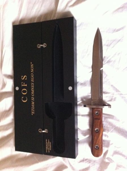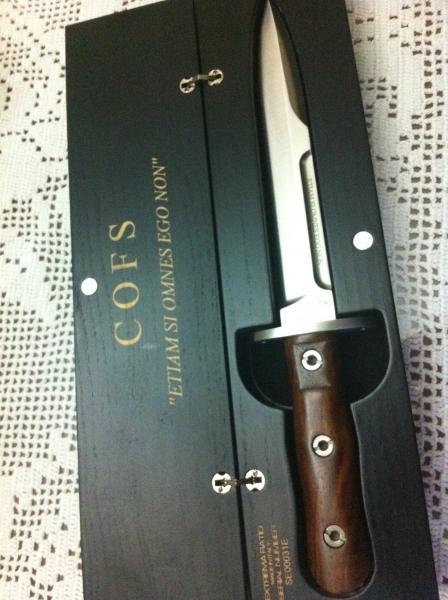 - Edición numerada pero NO limitada. Empuñadura de madera y acabado satinado para la hoja y partes metálicas. reproduciendo los materiales del original ("Pugnale da paracadutista assaltatore mod.1939"). Se presenta con el logo y la leyenda de las C.O.F.S. en una caja de madera negra y la funda para desfiles.