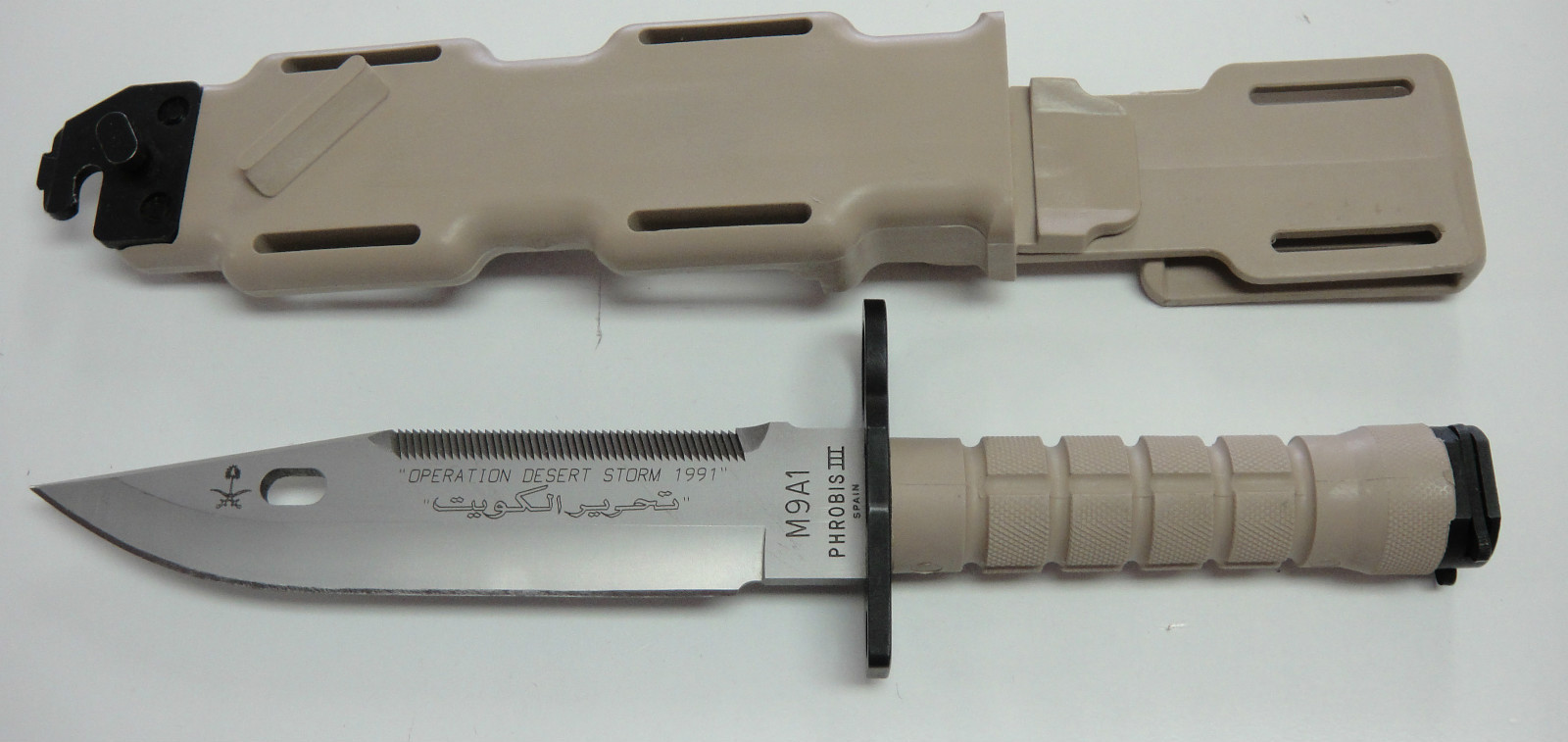 Se trata de una pieza conmemorativa de la "Operación Tormenta del Desierto" ("Operation Desert Storm") de PHROBIS en 1991, y está perfectamente documentada por Homer M. Brett, toda una autoridad en el coleccionismo de bayonetas y cuchillos.