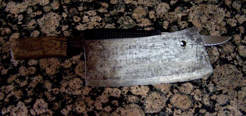 A la izquierda vemos el hacha de carnicero que compré el sábado en Gerona Ciudad: lleva una curiosa marca de fábrica: dos muñequitos columpiándose.