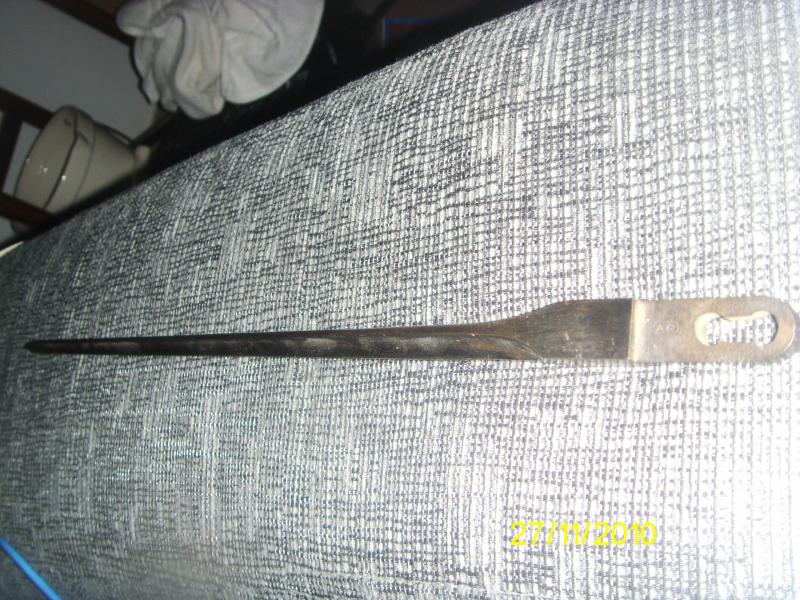 hace unos años cayeron en mis manos algunas bayonetas, una de mosin nagan, otras dos de mauser y otra que no me suena nada, debe ser de algun fusil moderno, la verdad ni idea.no tiene mango, parece de acero, solo tiene las iniciales AG. mide 37cm.i tiene dos acanaladuras. mando un par de fotos a ver si le suena a alguien. muchas gracias.