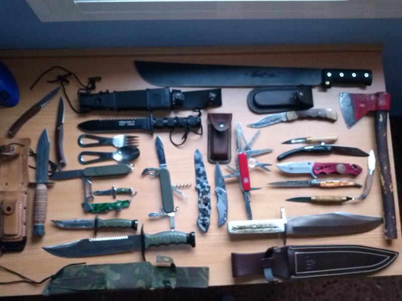 AIRSNIPER creo que se a equivocado al decir lo de chinada y no se a fijado usted bien en el material : hacha bellota ,los cuchillos dobles alce ,las navajas de madera de don Benito y Extremadura ,la navaja de la mili los cubiertos y la gran patrullero de Aitor , una Victorinox SwissChamp , la navaja camo una Buck , la de al lado una Gerber , un Ontario pilot , el Bowie cudeman , el King 2 y el machete Albainox ( Albacete ) y la navaja negra de al lado del Hacha una chinita .Hay de España , suiza ,EE.UU , y la navaja negra de china . Me gusta la serie the walking dead esta entretenida pero me va mas coleccionar que el Apocalipsis eso se lo dejo a los políticos .Un saludo y no desmerezcamos lo de los demás .