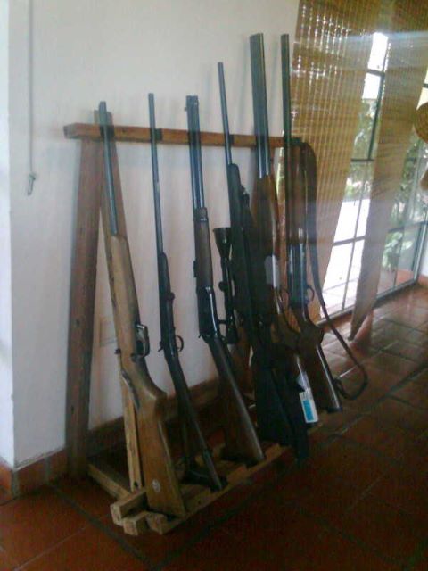 A tus carabinas no les va a pasar nada por dejarlas apoyadas contra la pared, no se van a doblar. Pero desde luego no es el mejor modo de guardarlas. Se pueden caer fácilmente y dañarse. Los maletines rígidos están bien para guardarlas (mejor en posición horizontal y sobre la parte ancha del maletín) y transportarlas, mucho mejor que las fundas de tela y espuma. Si lo que quieres es tenerlas en un rincón de casa de forma vertical puedes hacerte con cuatro tablas y un poco de maña un armero casero, de forma que queden bien aseguradas y no puedan caerse y golpearse. Te pongo unas imágenes de algunos hechos por compañeros para que te hagas una idea de lo que digo. El acabado final dependerá de lo exigente y curioso que seas. A los diseños de las imágenes primera y última habría que ponerles unos pestillos como los que llevan en la imagen segunda para asegurar las carabinas, de forma que no puedan caerse accidentalmente.
