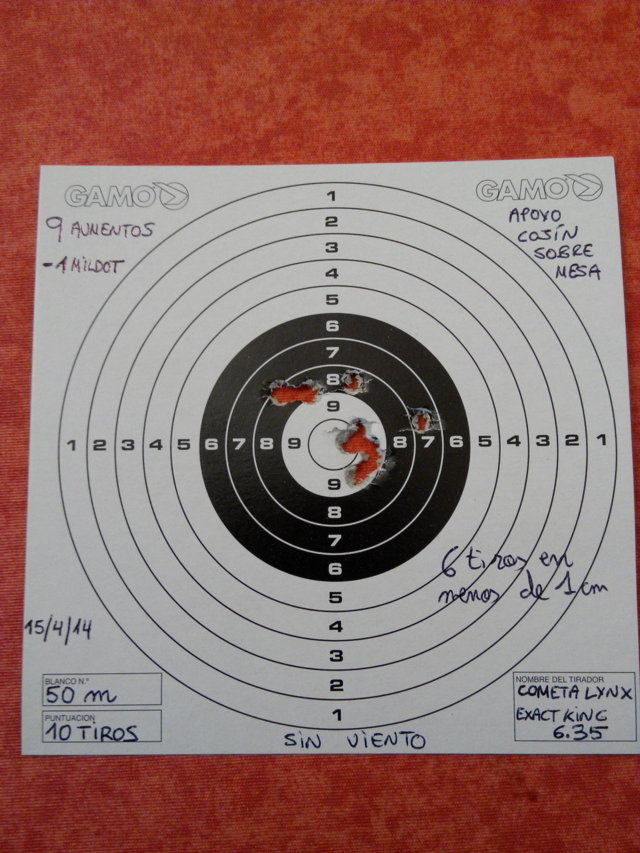 Las agrupaciones que muestro son 50 metros con exact king y cargador mono tiro, con un leapers 3-9x40, hechas a 9 aumentos.