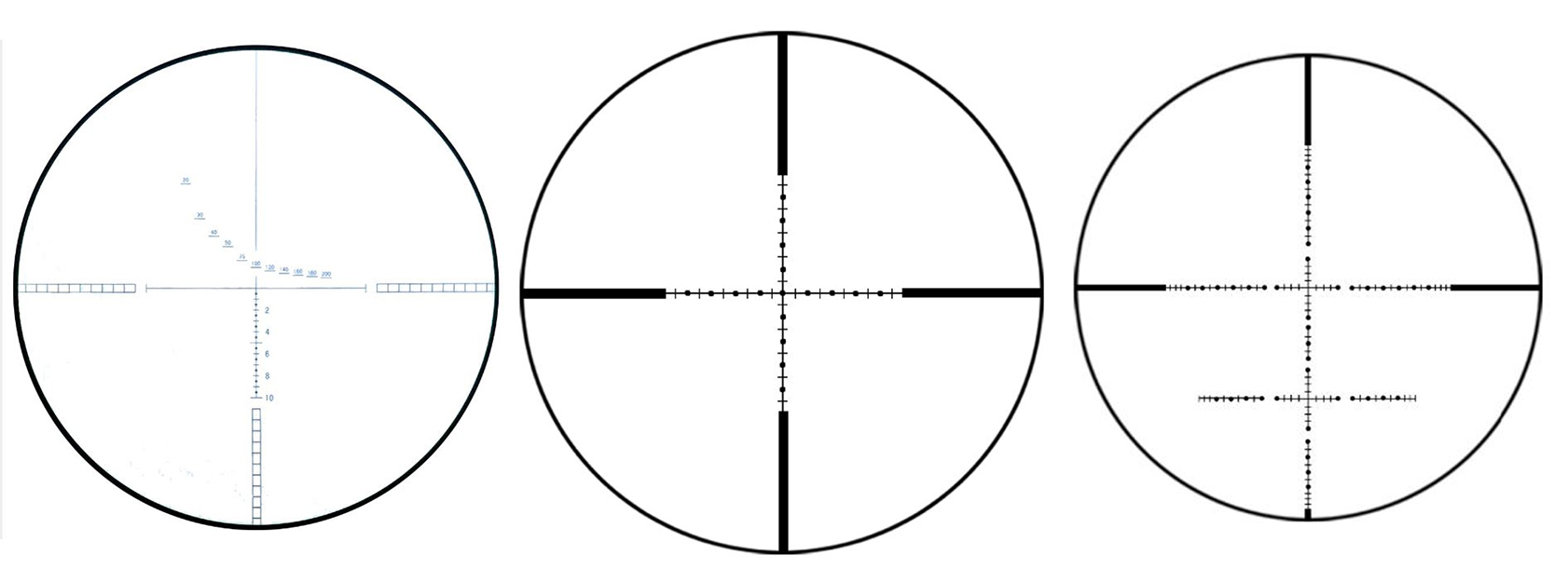 Las retículas, son Mil-Dot, 1/2 Mil-Dot, y la primera, la que trae números, es FFP (First Focal Plane), reticula en primer plano focal, que aumenta o disminuye según el zoom, manteniendo siempre constantes las proporciones entre puntos Mil-dot, es decir, que pongas el zoom que pongas, siempre habrá la distancia que marca entre mil-dot, que es 1m a 1000 m, 50 cm a 500 m, 5 cm a 50.....y la regla numerada es para medir distancias, según una medida conocida, seguramente un torso humano, o una figura humana de altura 1,70, esta reticula, es de las llamadas tácticas range finder.