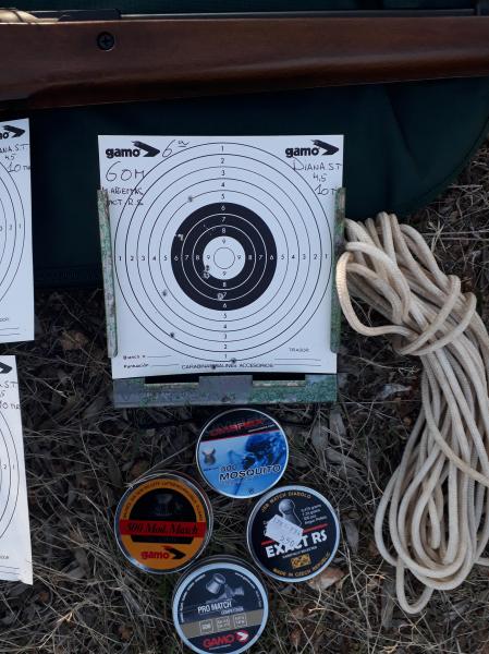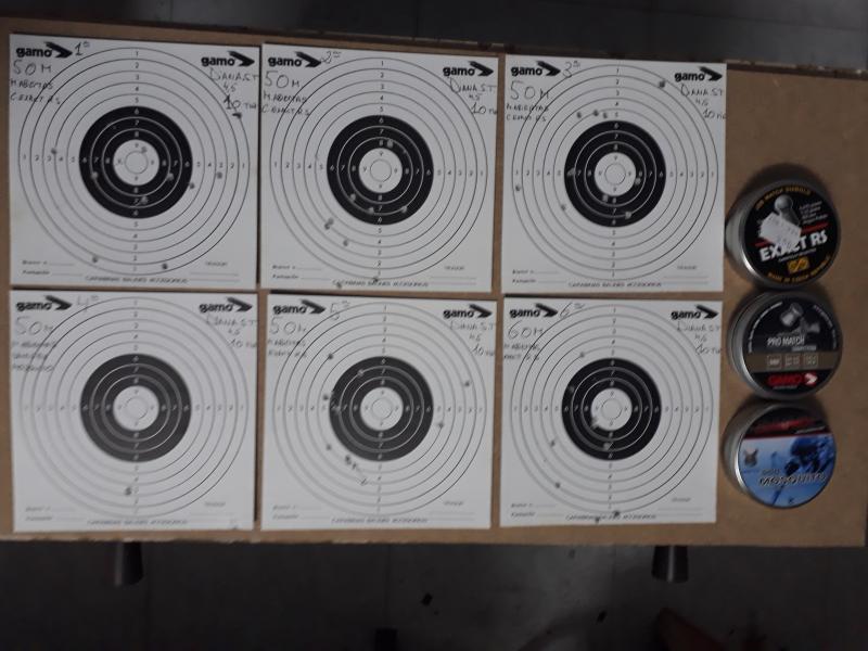 Bueno...empezaré con una perogrullada.No todos los balines valen para cada cañón,conviene probar vários.Esto lo digo por lo siguiente que van a poder ver;Tras tres dianas de diez tiros cada una,a 50m,con Jsb rs,me dispuse a cambiar y disparar(la cuarta diana) con Gamo Pro Match.Primeros dos tiros con Pro Match y "leche",ni siquiera toqué diana.Me dispuse a cambiar de nuevo a otros,los Umarex Mosquito...mas de lo mismo,penoso como pueden ver.