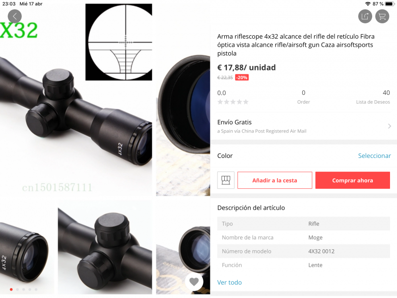 Eso,sin contar con los 25 pavos mas portes, a mayores, para comprar unas monturas de una pieza, de algo de un mínimo de calidad, como las Hawke de 4 tornillos, si no quieres ver como la montura se mueve 2 cm para atrás en cada tiro.....