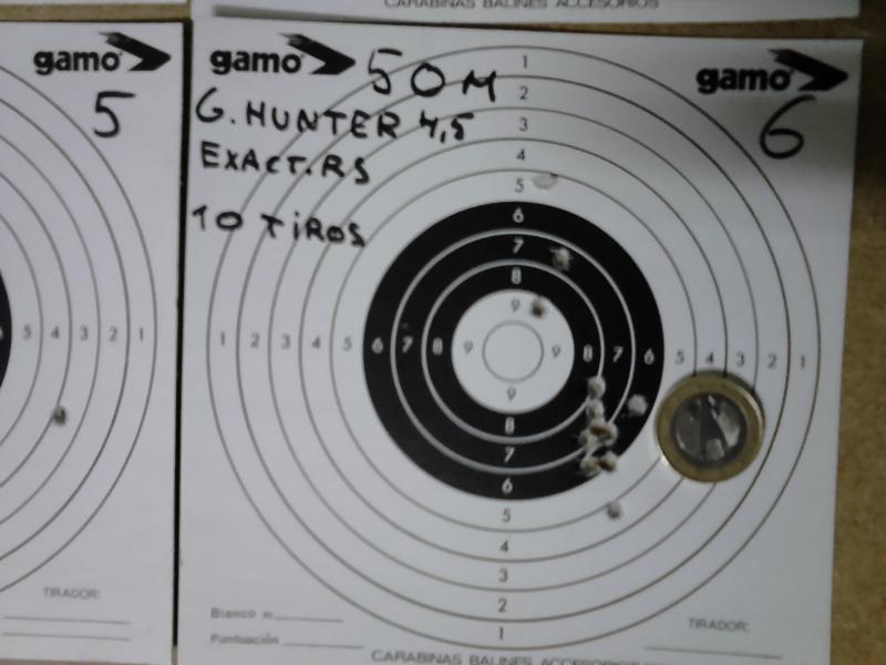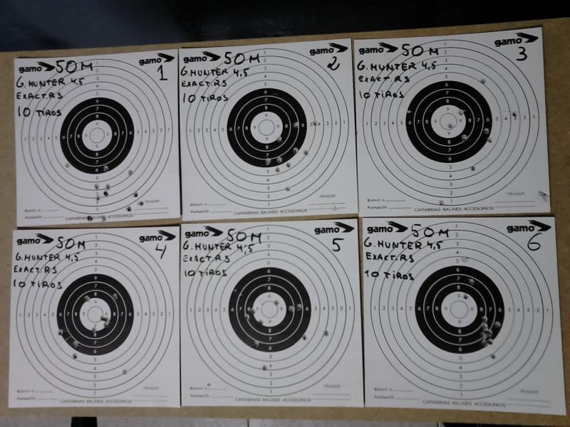 La distancia 50m medidos,con visor 3-9x32 de Gamo.La carabina una Hunter 440 (2007) con ajustes internos y cañón recortado y recoronado y bocacha de contrapeso.Los balines Exact rs de Cometa.