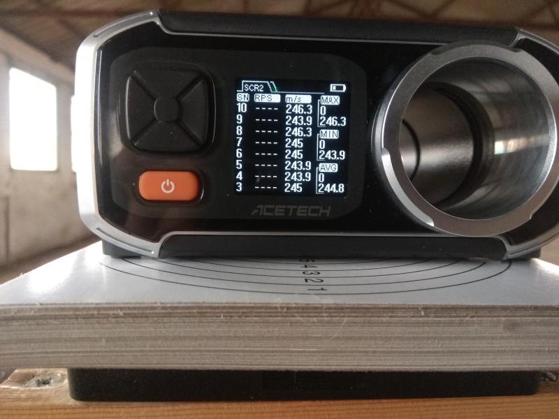 Mi chrony guarda las sesiones de disparos (en este caso 10 tiros por cada tipo de balín) y saca una media de la velocidad en m/s y te calcula los julios. Evidentemente con cada tipo de balín hay que ajustar los diferentes parámetros de calibre y peso (en gramos).