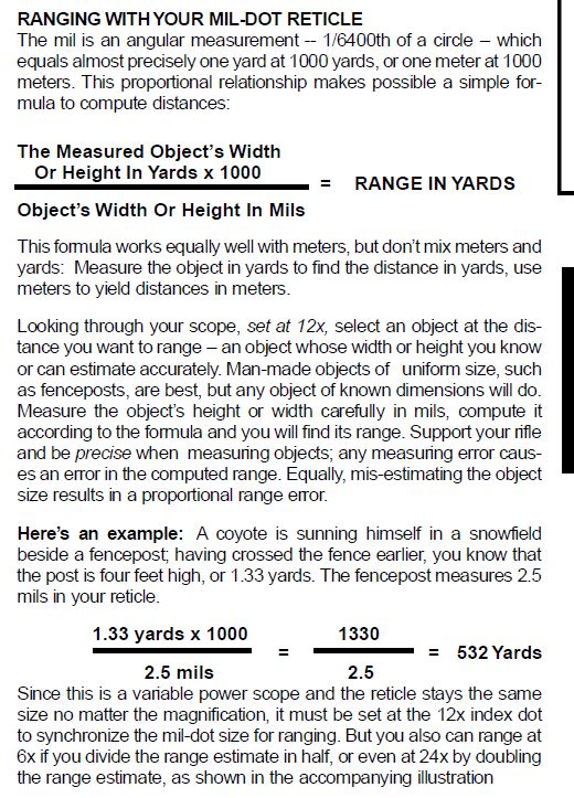 Con una retícula mil dot , se puede obtener la distancia de un objetivo de medidas conocidas con gran exactitud, aplicando la fórmula D=(Obj mts * (Zoom*100) ) / Dots observados.